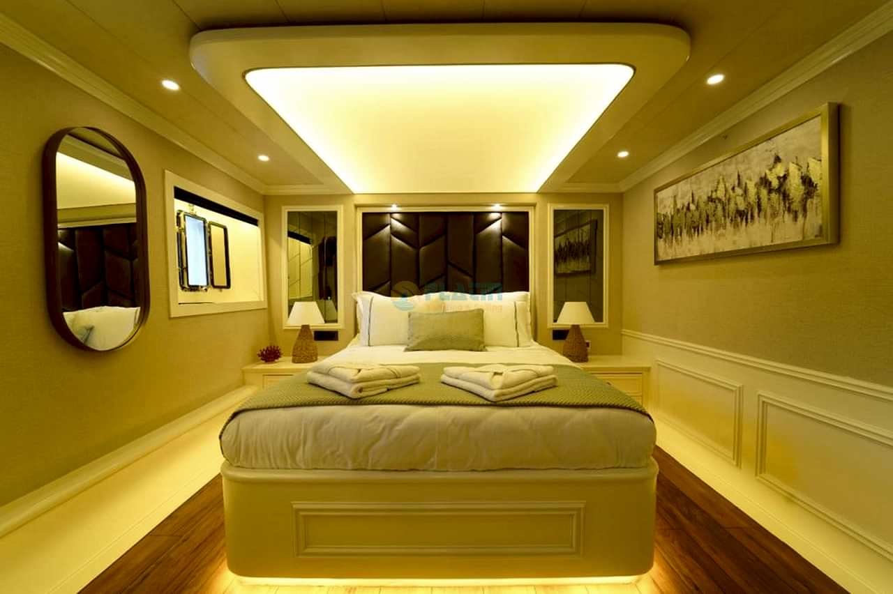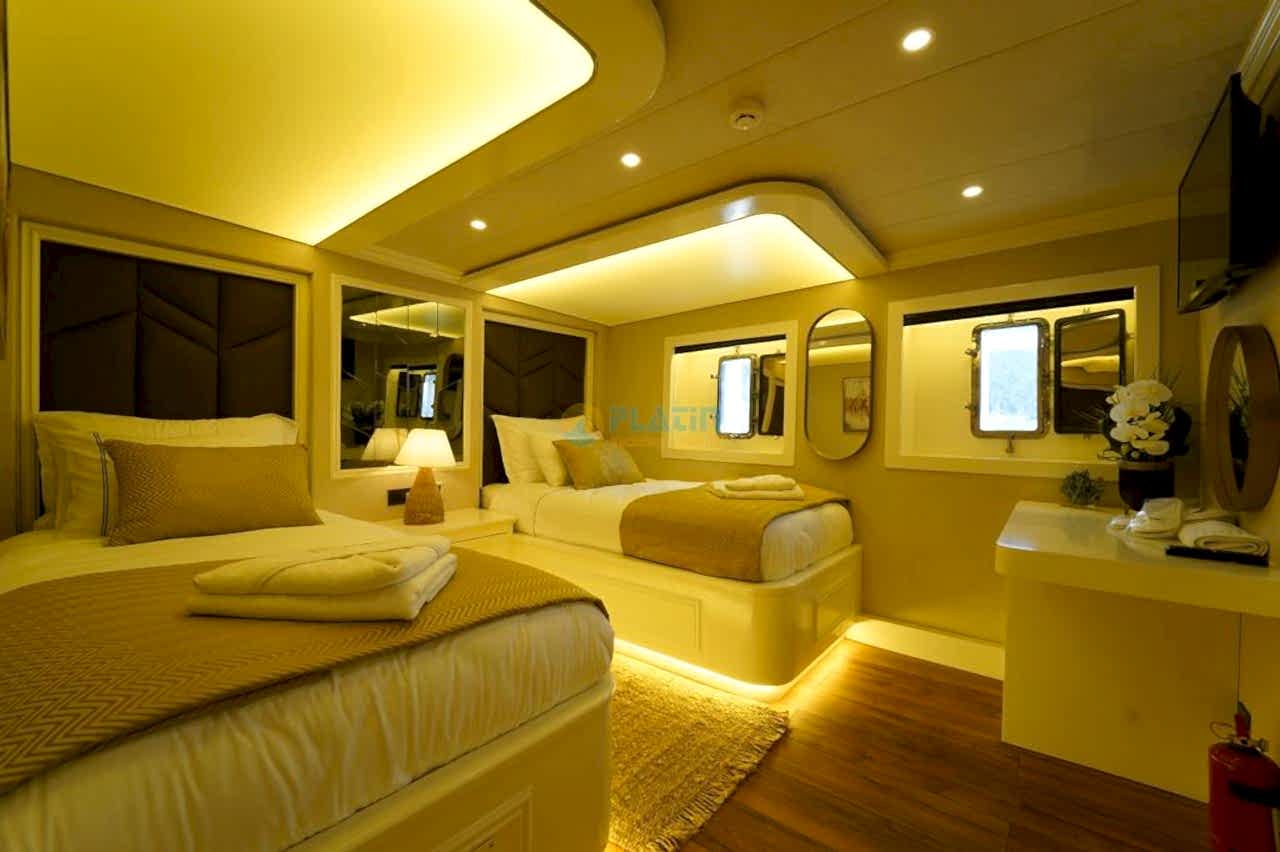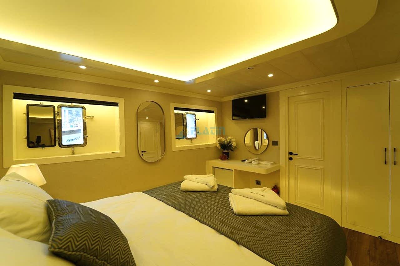 Queen of Makri offers 6 spacious and elegantly designed cabins to accommodate up to 12 guests in ultimate comfort. Each cabin is fully air-conditioned and features ensuite bathrooms, modern amenities, and stylish décor for a luxurious stay on board.