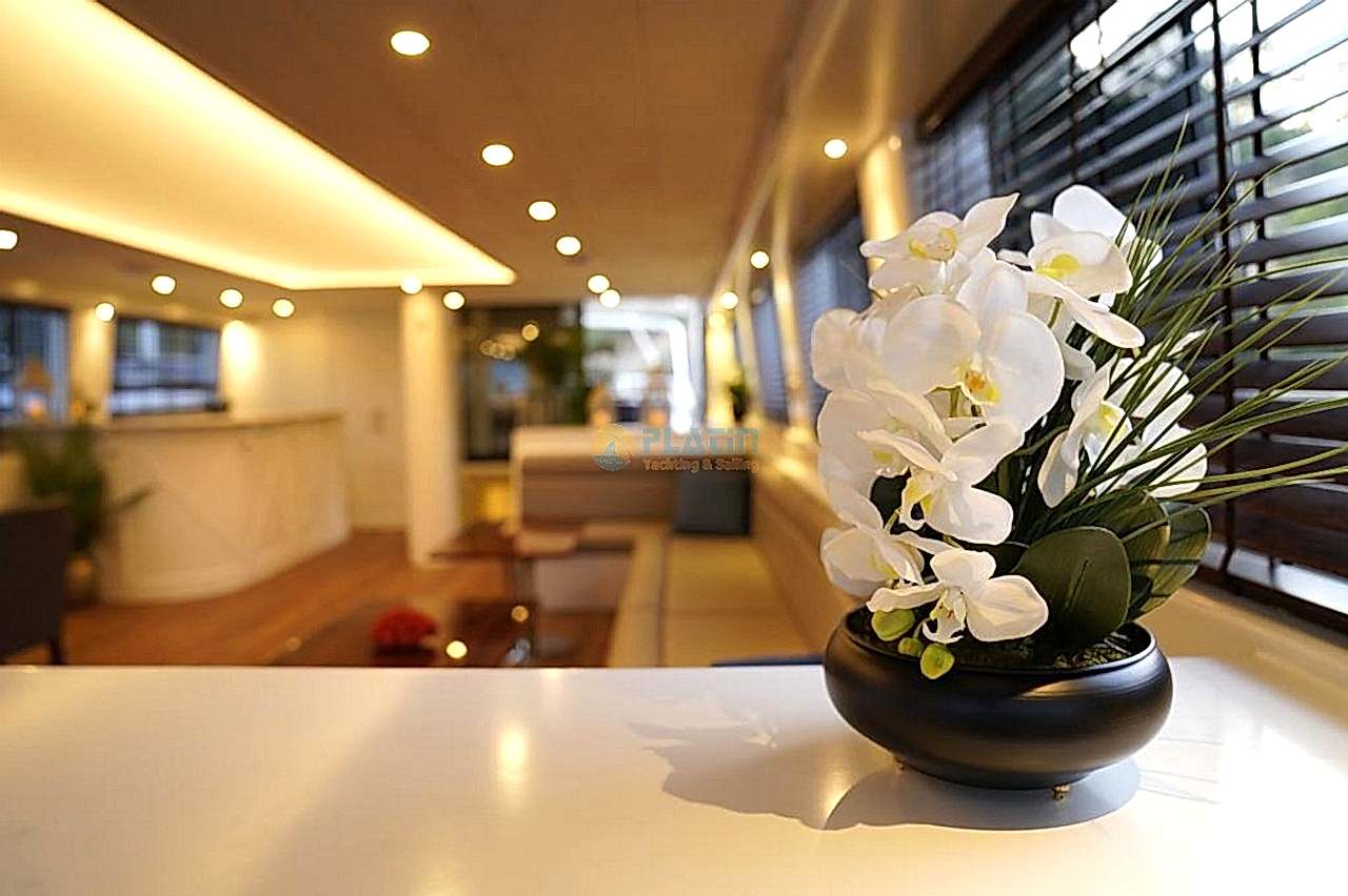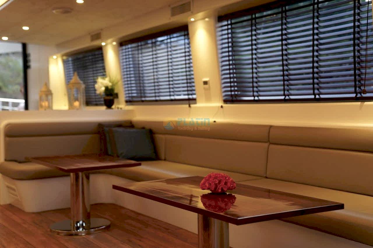 Deck Spaces: Large sunbathing area, alfresco dining spaces on fore and aft deck